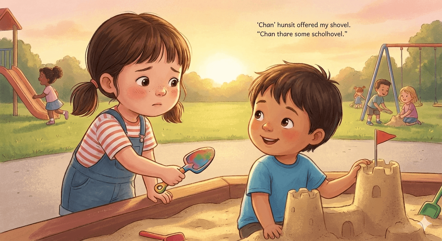 * 아이의 도전 : 아이는 용기를 내어 조개껍데기를 건넵니다. 친구가 환하게 웃으며 받아주자, 아이의 얼굴에도 미소가 번집니다.