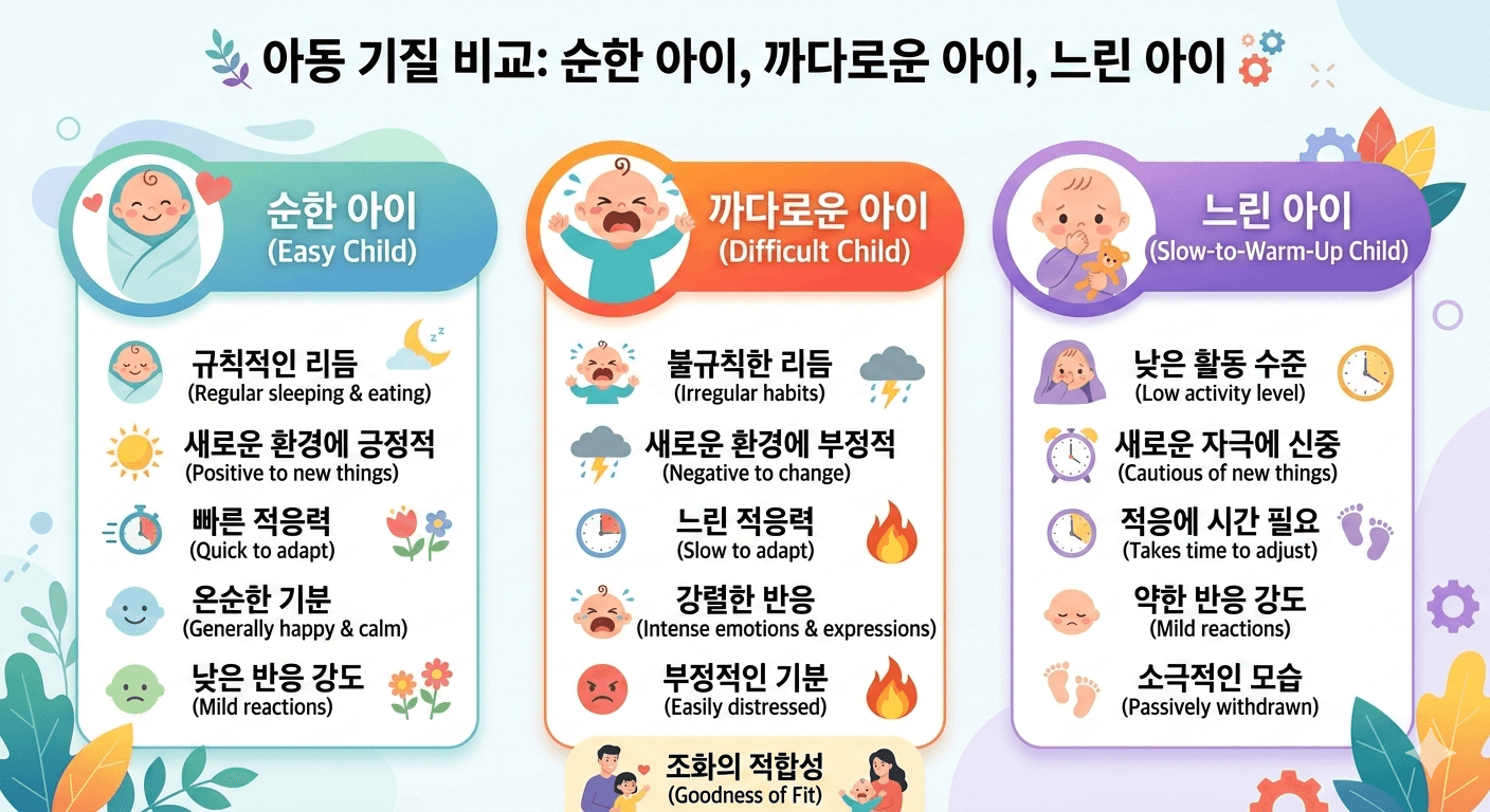 기질을 이해하는 것은 아이의 행동을 '문제'로 보는 시각에서 벗어나 '특성'으로 인정하는 첫걸음입니다.