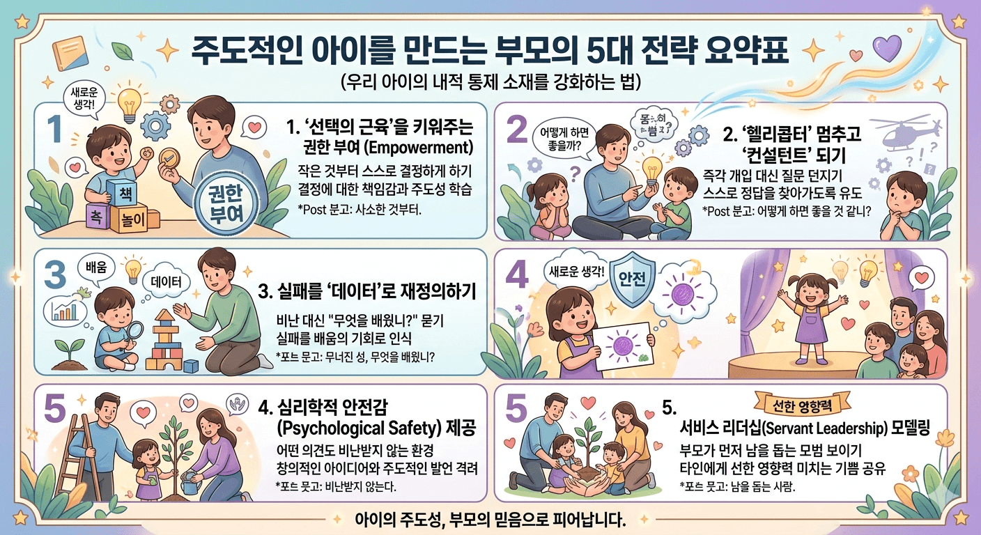 아이가 곤경에 처했을 때 즉각 개입하여 해결해 주는 것은 리더십의 싹을 자르는 행위인데, 아이가 도움을 요청할 때 "어떻게 하면 좋을 것 같니?"라고 먼저 물어보세요. 부모는 정답을 제시하는 사람이 아니라, 아이가 스스로 정답을 찾아가도록 유도하는 질문자가 되어야 합니다.