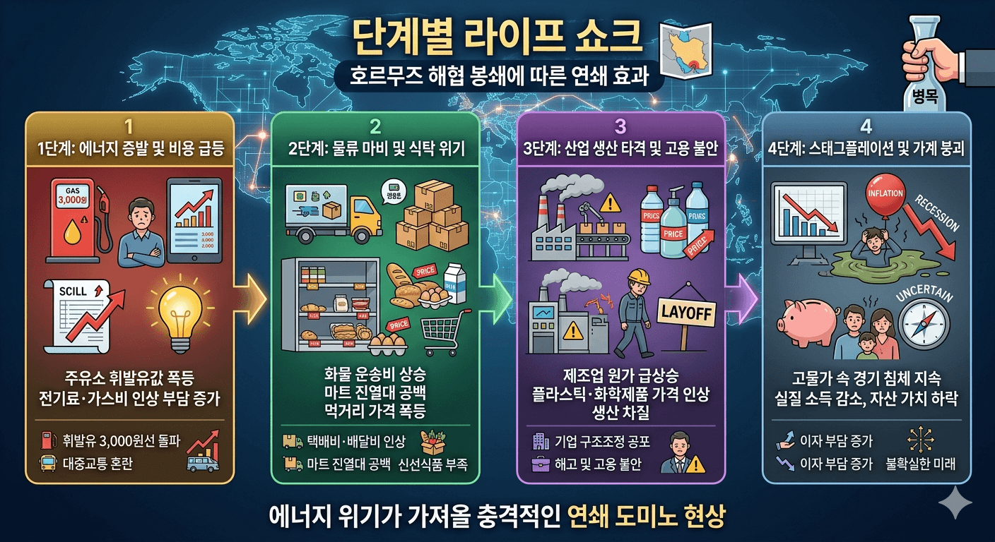 **메인 키워드:** 호르무즈 해협 봉쇄, 국제 유가 전망, 2026 에너지 위기, 기름값 3000원, 물가 폭등 이유, 스태그플레이션 대처